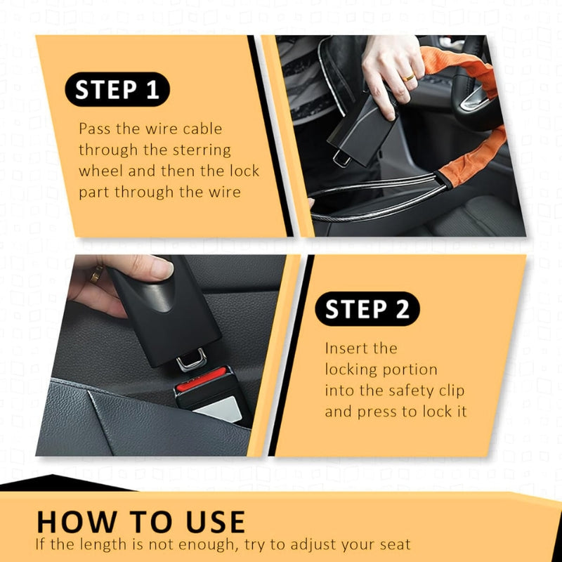Steel cable of the car steering wheel lock is long enough to adjust to lock the steering wheel and car seat tightly. It fits most cars on the market, so you don't have to worry about compatibility. The anti-theft performance and universality are stronger, which gives you more peace of mind!